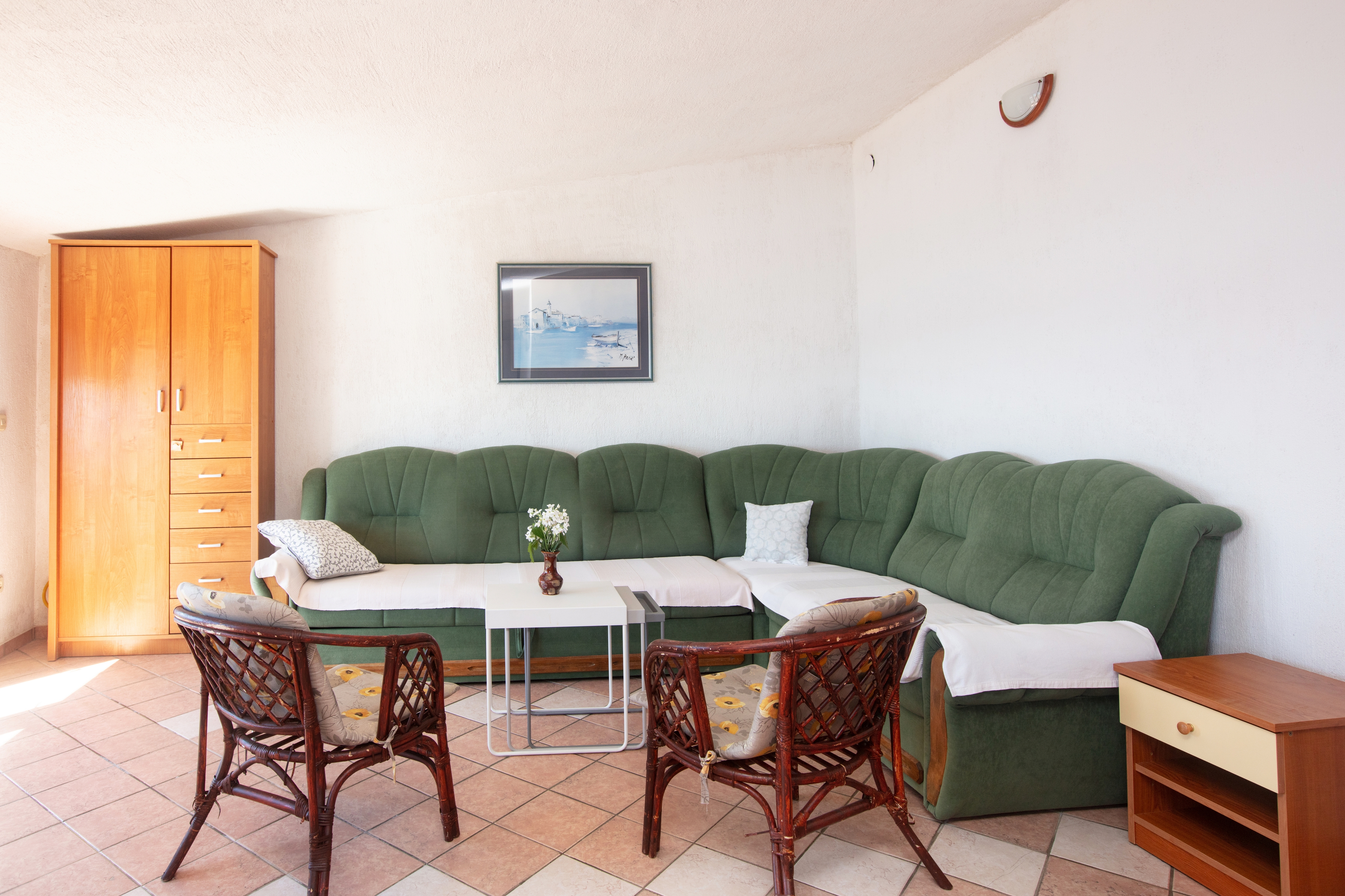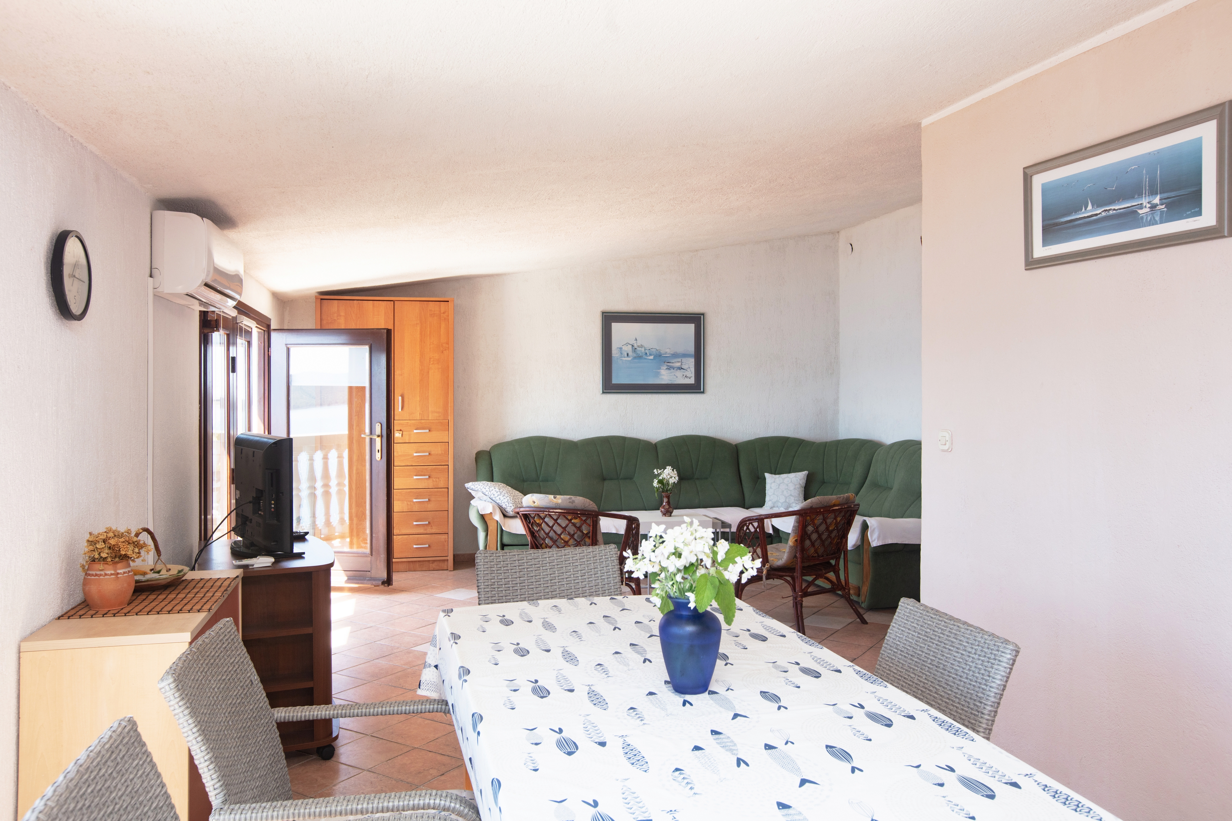 Apartment can accommodate 6 guests. Beds are situated in 2 sleeping rooms, but also in the living room, within 62m2. Guests can use a private balcony to enjoy the warm summer evenings. The apartment offers the sea view. Food can be prepared using barbecue which is shared with other guests too. INCLUDED IN THE PRICE: tourist tax, final cleaning, air-conditioning, parking, internet. OBLIGATORY ADDITIONAL COSTS: short stay fee (surcharge depending on a number of booked nights: 30% - 1, 20% - 2, 10% - 3). The availability of additional services for your chosen dates of stay, as well as their prices (if none are listed) must be checked ahead of time. Any additional services not shown in the price calculation are payable directly to the property owner and only if used by the visitor.