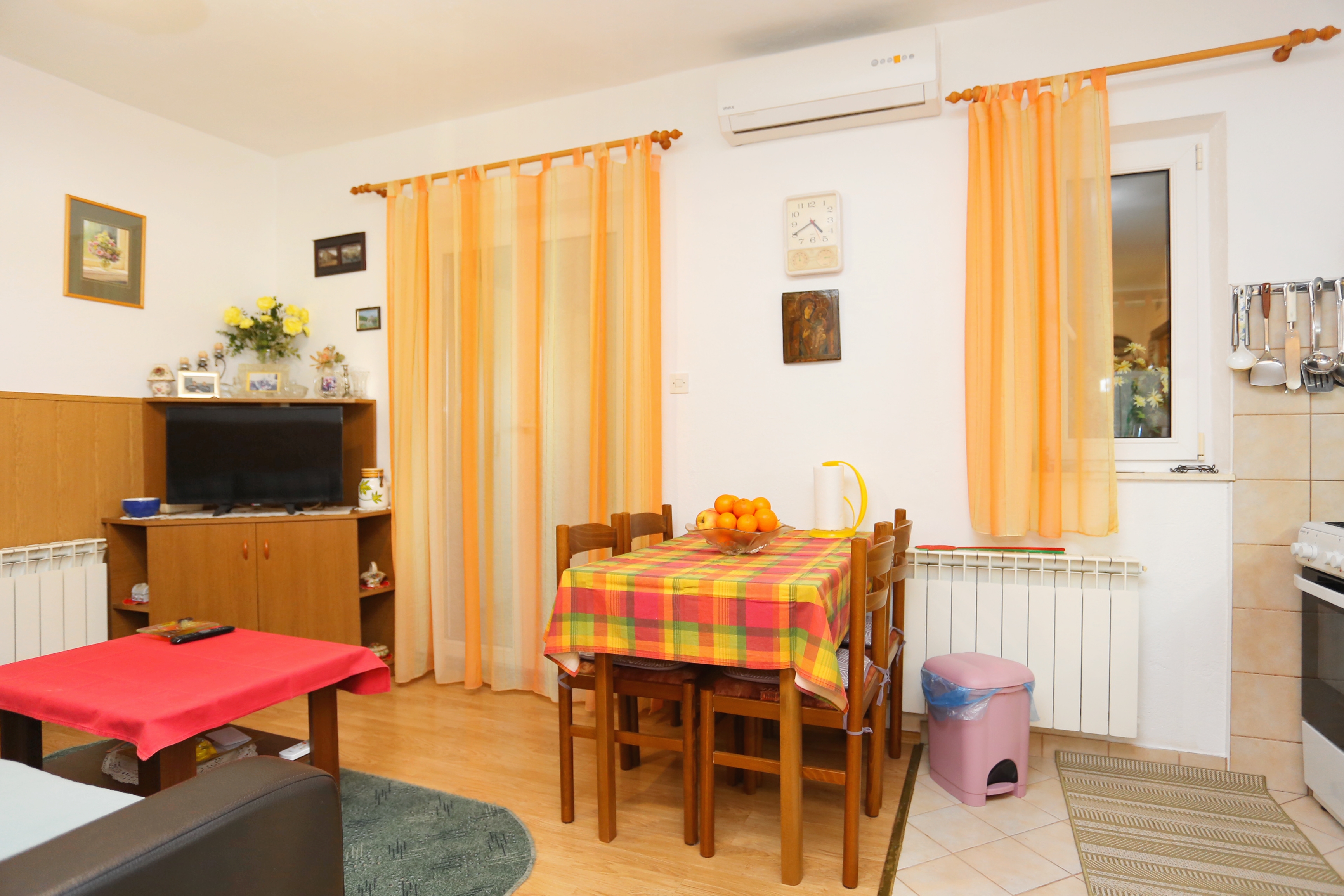 Apartment can accommodate 6 guests. Beds are situated in 3 sleeping rooms, but also in the living room, within 48m2. Guests can use a private terrace to enjoy the warm summer evenings. For full enjoyment and relaxation there is a private barbecue for this accommodation guests only. This accommodation unit welcomes pets at an additional charge. In this accommodation unit bedroom leads to other rooms. INCLUDED IN THE PRICE: tourist tax, final cleaning, air-conditioning, parking, internet, iron, ironing board, hairdryer. OPTIONAL ADDITIONAL COSTS: pets (€8.00 per night). The availability of additional services for your chosen dates of stay, as well as their prices (if none are listed) must be checked ahead of time. Any additional services not shown in the price calculation are payable directly to the property owner and only if used by the visitor.