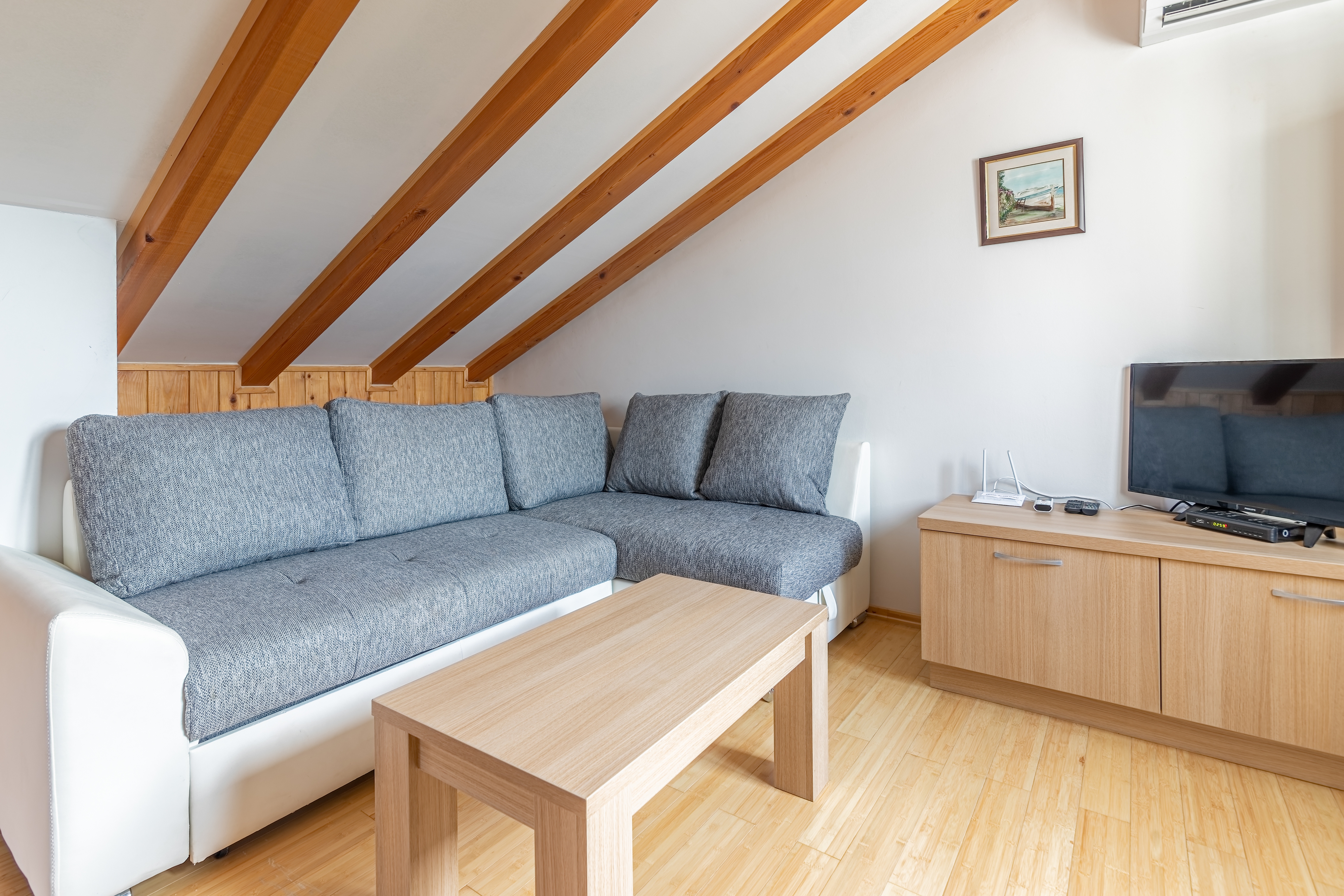 Apartment can accommodate 4 guests. Beds are situated in 2 sleeping rooms, within 55m2. Food can be prepared using barbecue which is shared with other guests too. Shared pool is on disposal during stay. There is no balcony or terrace in the reserved accommodation unit. INCLUDED IN THE PRICE: tourist tax, final cleaning, air-conditioning, pool, parking, garage, internet, laundry, additional bed, iron, ironing board, sunshade, sunchairs. OBLIGATORY ADDITIONAL COSTS: short stay fee (surcharge depending on a number of booked nights: 30% - 1, 20% - 2, 10% - 3). The availability of additional services for your chosen dates of stay, as well as their prices (if none are listed) must be checked ahead of time. Any additional services not shown in the price calculation are payable directly to the property owner and only if used by the visitor. Discounts to the base price: free day 21=19 (for reservations of 21 or more days you get 2 free days for the stay until 31122026).