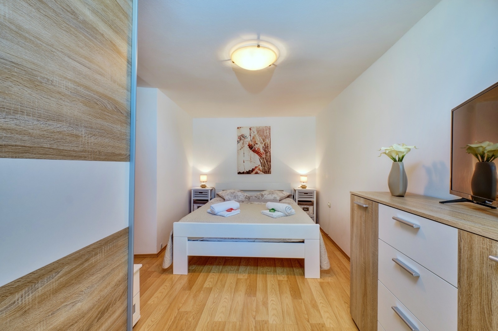 Apartment can accommodate 2 guests. Beds are situated in 1 sleeping rooms, within 35m2. Guests can use a private terrace to enjoy the warm summer evenings. INCLUDED IN THE PRICE: tourist tax, final cleaning, air-conditioning, parking, internet, hairdryer. OBLIGATORY ADDITIONAL COSTS: short stay fee (surcharge depending on a number of booked nights: 30% - 1, 20% - 2, 10% - 3). The availability of additional services for your chosen dates of stay, as well as their prices (if none are listed) must be checked ahead of time. Any additional services not shown in the price calculation are payable directly to the property owner and only if used by the visitor. Discounts to the base price: free day 14=13 (for reservations of 14 or more days you get one free day for the stay until 31122026).