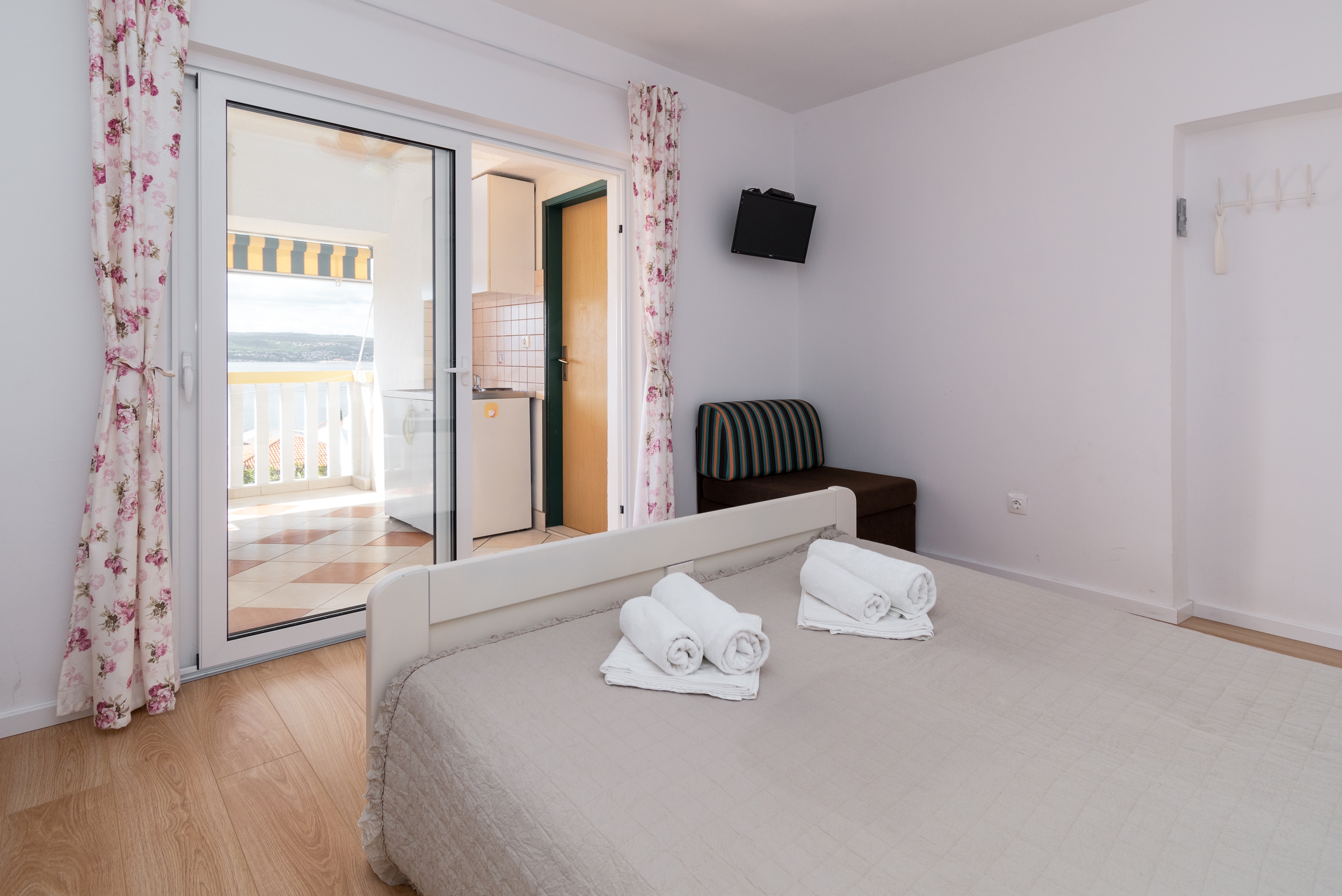 Studio flat can accommodate 2 guests. Beds are situated in 1 sleeping rooms, within 18m2. Guests can use a private terrace to enjoy the warm summer evenings. The studio offers the sea view. Food can be prepared using barbecue which is shared with other guests too. INCLUDED IN THE PRICE: tourist tax, final cleaning, air-conditioning, parking, internet, iron. OBLIGATORY ADDITIONAL COSTS: short stay fee (surcharge depending on a number of booked nights: 30% - 1, 20% - 2, 10% - 3). OPTIONAL ADDITIONAL COSTS: laundry (€3.00 washing). The availability of additional services for your chosen dates of stay, as well as their prices (if none are listed) must be checked ahead of time. Any additional services not shown in the price calculation are payable directly to the property owner and only if used by the visitor.