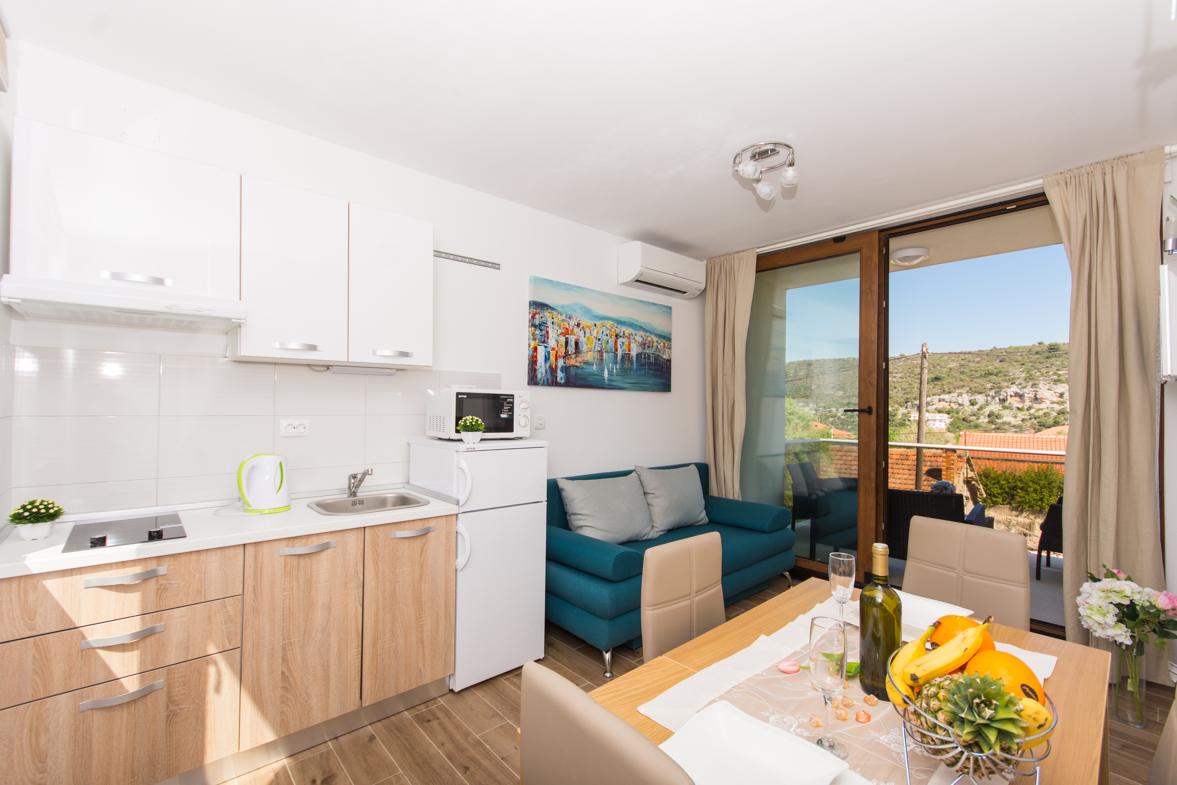 Apartment can accommodate 4 guests. Beds are situated in 1 sleeping rooms, but also in the living room, within 35m2. Guests can use a private balcony to enjoy the warm summer evenings. The apartment offers the sea view. Food can be prepared using barbecue which is shared with other guests too. Shared pool is on disposal during stay. INCLUDED IN THE PRICE: tourist tax, final cleaning, air-conditioning, pool, parking, internet, laundry, boat mooring, iron, ironing board, hairdryer. OPTIONAL ADDITIONAL COSTS: boat (€100.00 per night). The availability of additional services for your chosen dates of stay, as well as their prices (if none are listed) must be checked ahead of time. Any additional services not shown in the price calculation are payable directly to the property owner and only if used by the visitor.