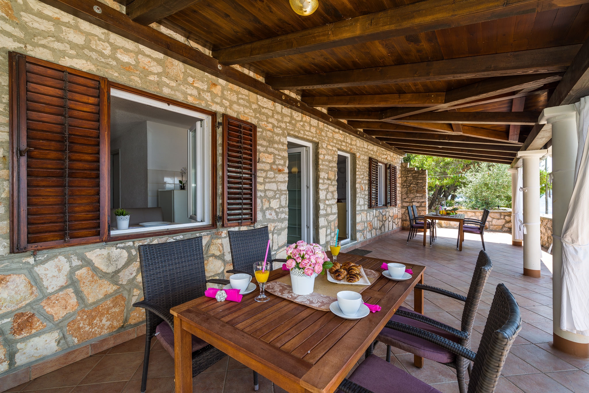 Studio flat can accommodate 4 guests. Beds are situated in 1 sleeping rooms, but also in the living room, within 23m2. Guests can use a private terrace to enjoy the warm summer evenings. The studio offers the sea view. Food can be prepared using barbecue which is shared with other guests too. This accommodation unit welcomes pets at no additional costs. INCLUDED IN THE PRICE: tourist tax, final cleaning, parking, boat mooring, pets, baby cot, transport to the property (service providers boat), sunshade, sunchairs. OBLIGATORY ADDITIONAL COSTS: short stay fee (surcharge depending on a number of booked nights: 30% - 1, 20% - 2, 10% - 3). OPTIONAL ADDITIONAL COSTS: boat (€25.00 per night). The availability of additional services for your chosen dates of stay, as well as their prices (if none are listed) must be checked ahead of time. Any additional services not shown in the price calculation are payable directly to the property owner and only if used by the visitor.
