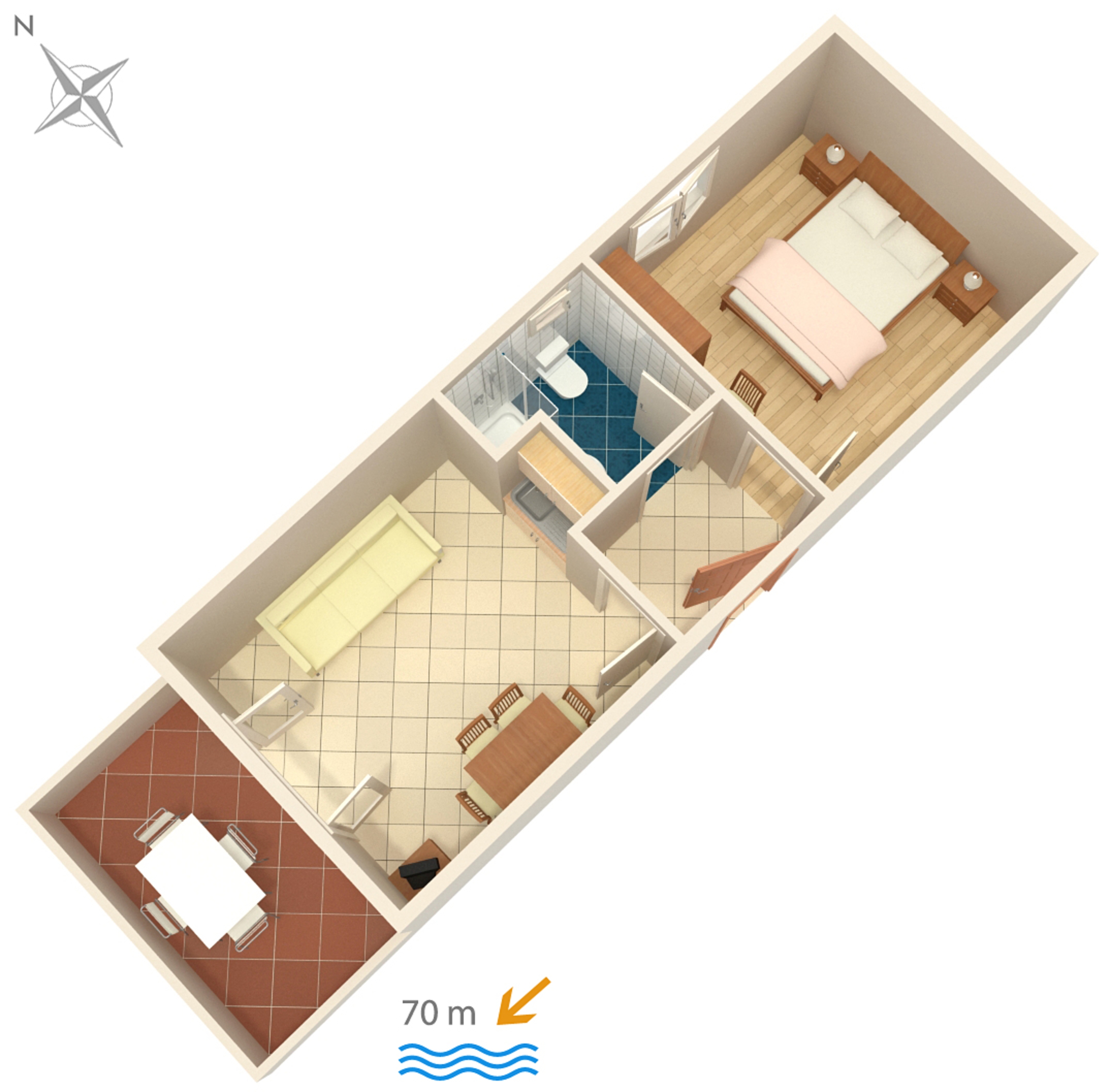 Apartment can accommodate 4 guests. Beds are situated in 1 sleeping rooms, but also in the dining room, within 36m2. Guests can use a private terrace to enjoy the warm summer evenings. The apartment offers the sea view. Food can be prepared using barbecue which is shared with other guests too. INCLUDED IN THE PRICE: tourist tax, final cleaning, air-conditioning, parking, internet, boat mooring, iron, ironing board, hairdryer. OBLIGATORY ADDITIONAL COSTS: short stay fee (surcharge depending on a number of booked nights: 30% - 1, 20% - 2, 10% - 3). OPTIONAL ADDITIONAL COSTS: boat (€50.00 per night). The availability of additional services for your chosen dates of stay, as well as their prices (if none are listed) must be checked ahead of time. Any additional services not shown in the price calculation are payable directly to the property owner and only if used by the visitor. Discounts to the base price: free day 14=13 (for reservations of 14 or more days you get one free day for the stay until 31122026).
