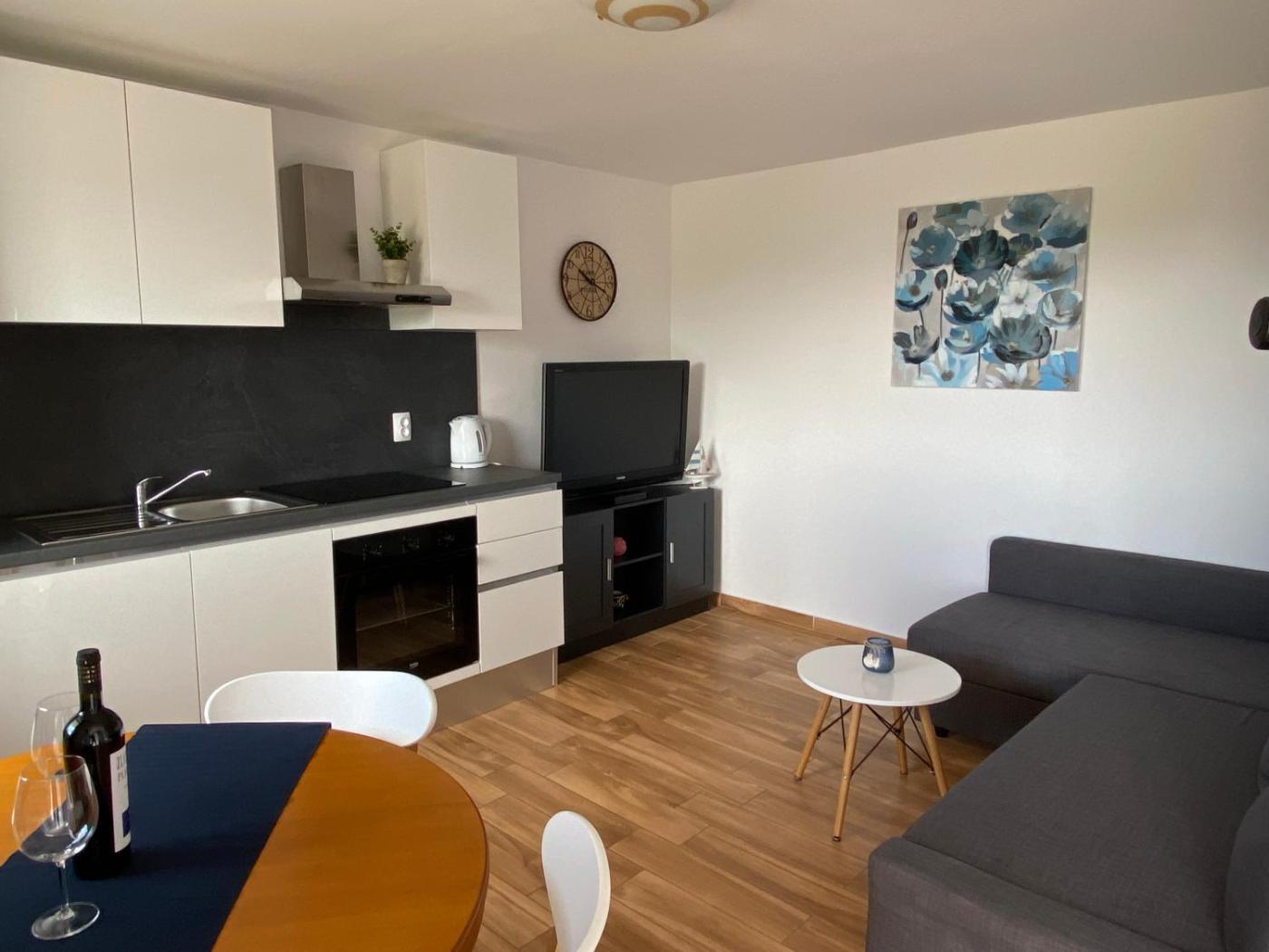 One-Bedroom Apartment. Featuring a private entrance, this air-conditioned apartment comprises 1 living room, 1 separate bedroom and 1 bathroom with a bath or a shower and a hairdryer. Guests will find a stovetop, a refrigerator, a dishwasher and kitchenware in the kitchen. The apartment also provides guests with a barbecue. Boasting a terrace with sea views, this apartment also provides a washing machine and a flat-screen TV. The unit offers 2 beds.