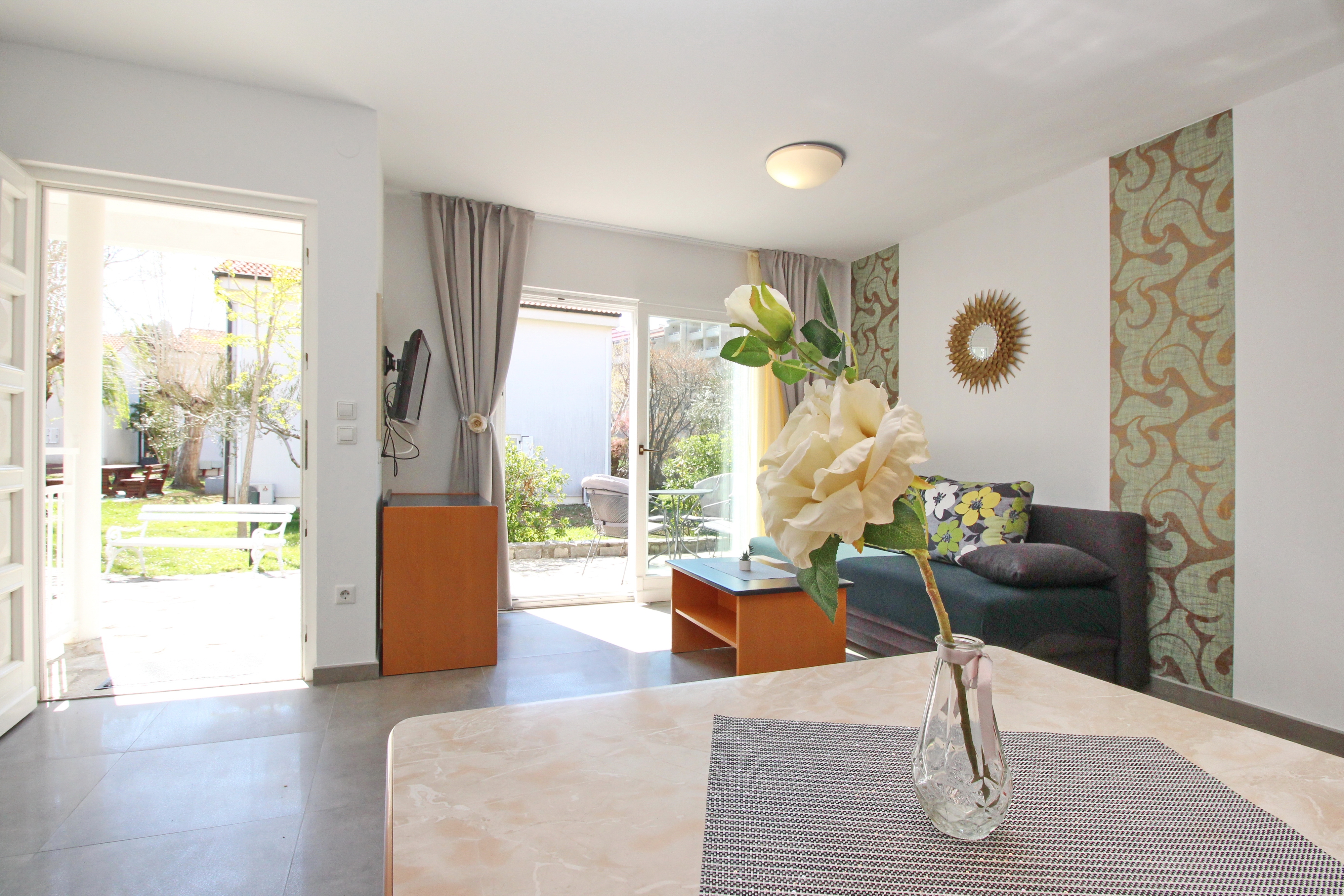 Apartment can accommodate 4 guests. Beds are situated in 1 sleeping rooms, but also in the living room, within 53m2. Guests can use a private terrace to enjoy the warm summer evenings. Food can be prepared using barbecue which is shared with other guests too. This accommodation unit welcomes pets at an additional charge. INCLUDED IN THE PRICE: final cleaning, air-conditioning, internet, laundry. OBLIGATORY ADDITIONAL COSTS: tourist tax (adults €0.93 - €2.20 nightperson, discount for children aged 12 - 17), short stay fee (surcharge depending on a number of booked nights: 30% - 1, 20% - 2, 10% - 3). OPTIONAL ADDITIONAL COSTS: pets (€15.00 per night). The availability of additional services for your chosen dates of stay, as well as their prices (if none are listed) must be checked ahead of time. Any additional services not shown in the price calculation are payable directly to the property owner and only if used by the visitor.
