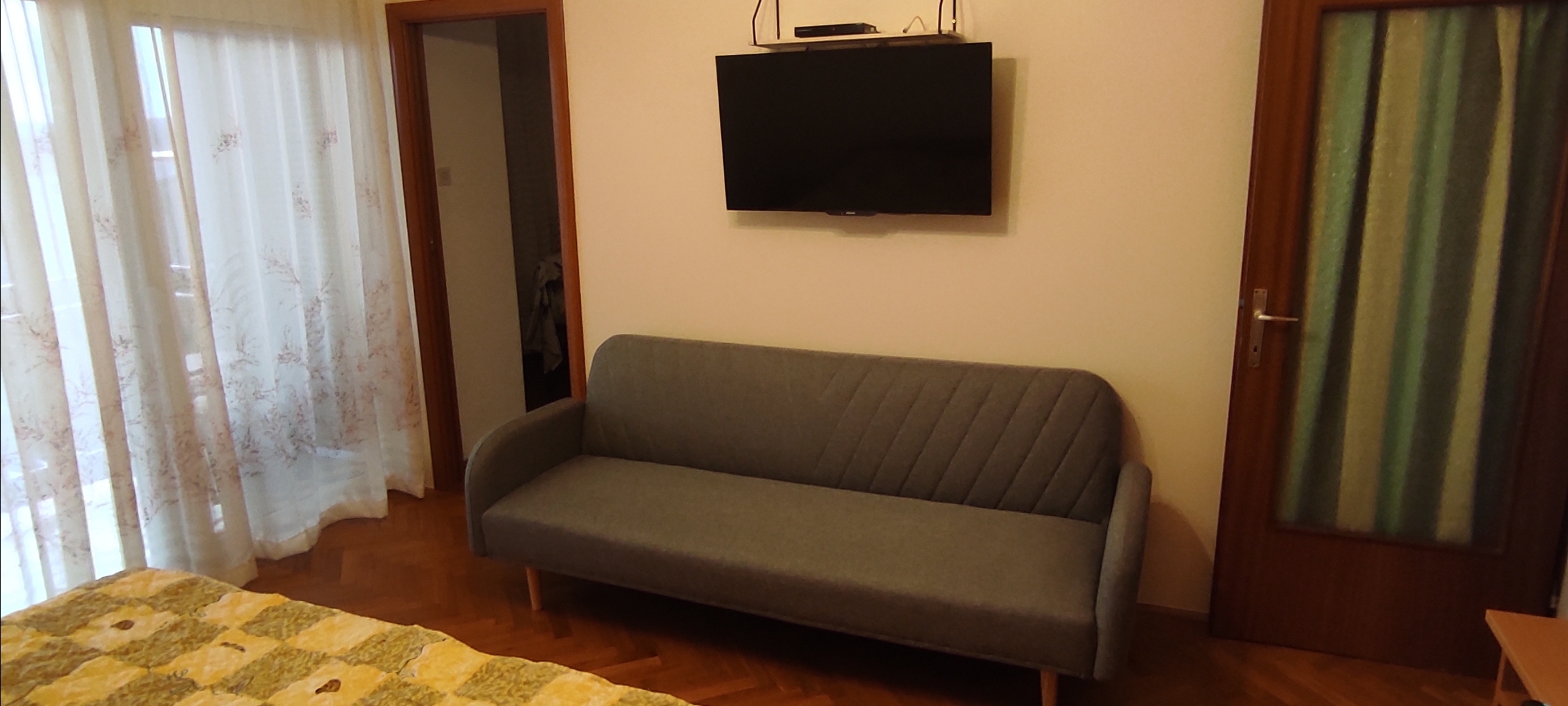 Apartment can accommodate 5 guests. Beds are situated in 2 sleeping rooms, within 50m2. Guests can use a private balcony to enjoy the warm summer evenings. The apartment offers the sea view. Food can be prepared using barbecue which is shared with other guests too. This accommodation unit welcomes pets at an additional charge. INCLUDED IN THE PRICE: tourist tax, final cleaning, air-conditioning, central heating, parking, internet, laundry. OBLIGATORY ADDITIONAL COSTS: short stay fee (surcharge depending on a number of booked nights: 30% - 1, 20% - 2, 10% - 3). OPTIONAL ADDITIONAL COSTS: pets (€5.00 per night). The availability of additional services for your chosen dates of stay, as well as their prices (if none are listed) must be checked ahead of time. Any additional services not shown in the price calculation are payable directly to the property owner and only if used by the visitor. Discounts to the base price: free day 14=13 (for reservations of 14 or more days you get one free day for the stay until 31122026).