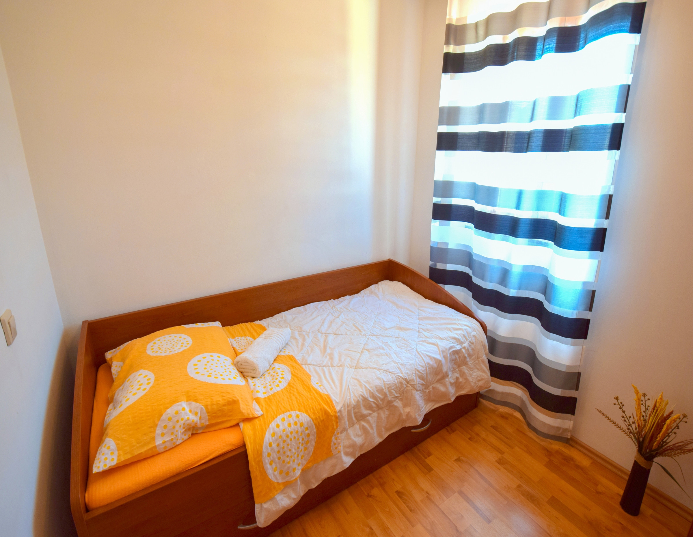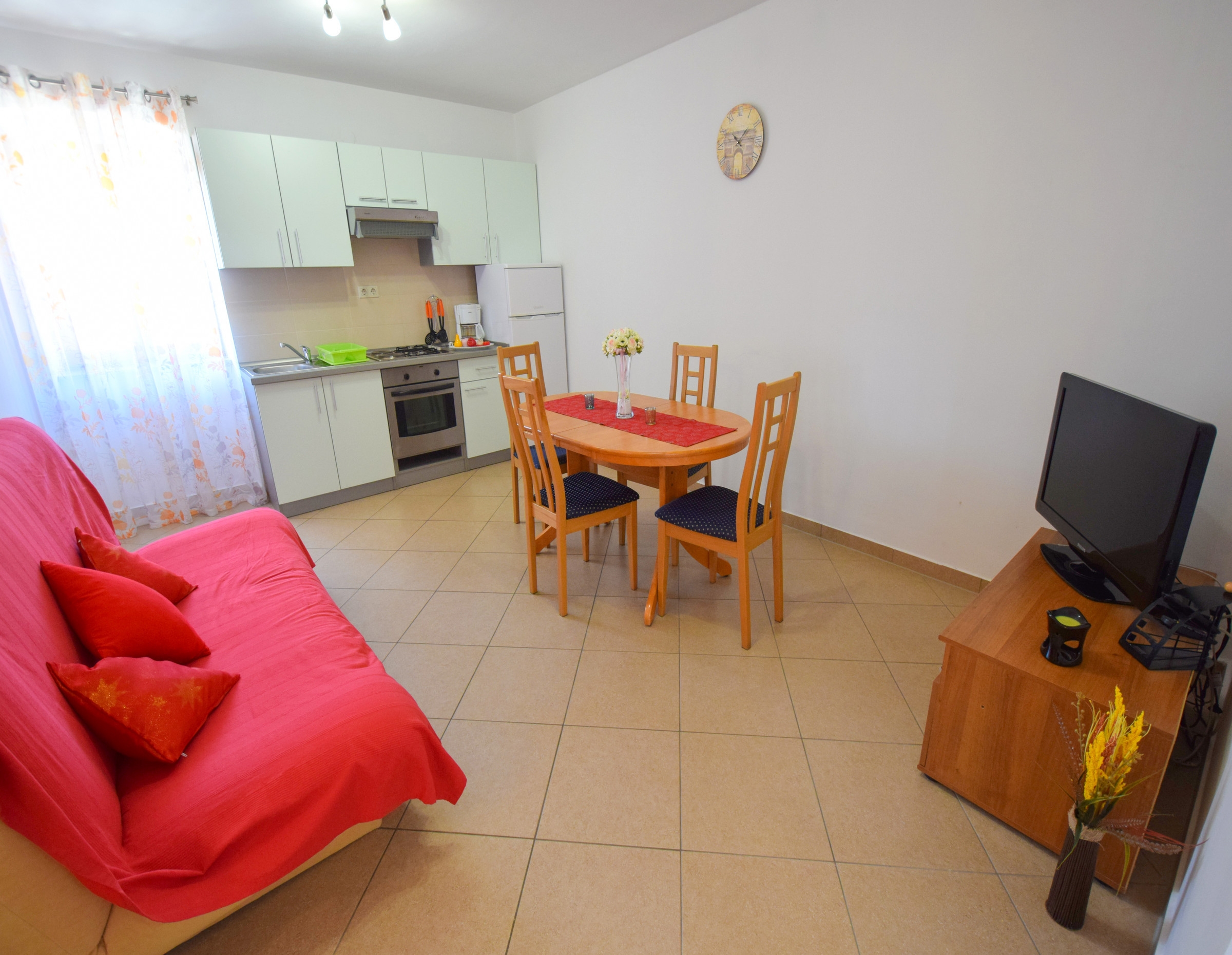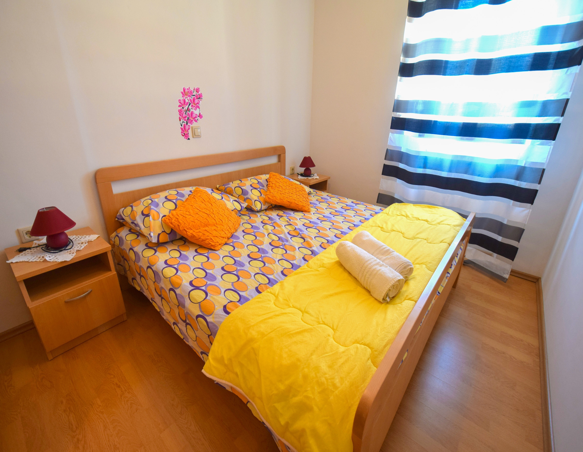 Apartment can accommodate 5 guests. Beds are situated in 2 sleeping rooms, but also in the living room, within 60m2. Guests can use a private terrace to enjoy the warm summer evenings. The apartment offers the sea view. Food can be prepared using barbecue which is shared with other guests too. This accommodation unit welcomes pets at an additional charge. INCLUDED IN THE PRICE: tourist tax, final cleaning, air-conditioning, parking, internet. OBLIGATORY ADDITIONAL COSTS: short stay fee (surcharge depending on a number of booked nights: 30% - 1, 20% - 2, 10% - 3). OPTIONAL ADDITIONAL COSTS: pets (€10.00 per night). The availability of additional services for your chosen dates of stay, as well as their prices (if none are listed) must be checked ahead of time. Any additional services not shown in the price calculation are payable directly to the property owner and only if used by the visitor.