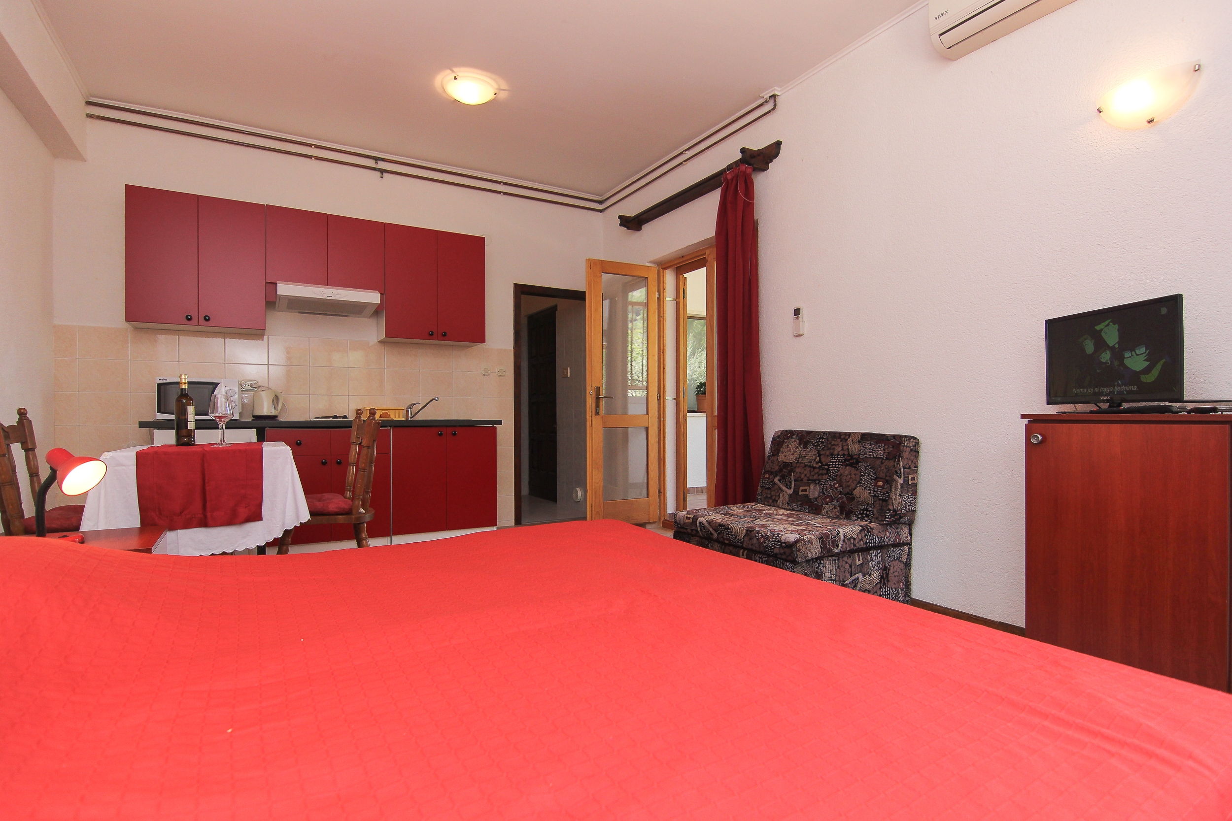 Studio flat can accommodate 2 guests. Beds are situated in 1 sleeping rooms, within 19m2. Guests can use a private terrace to enjoy the warm summer evenings. Food can be prepared using barbecue which is shared with other guests too. Shared pool is on disposal during stay. INCLUDED IN THE PRICE: tourist tax, final cleaning, air-conditioning, pool, parking, internet, baby cot, iron, ironing board, hairdryer, 1 bed for children (included in the price). OPTIONAL ADDITIONAL COSTS: laundry (€3.00 washing). The availability of additional services for your chosen dates of stay, as well as their prices (if none are listed) must be checked ahead of time. Any additional services not shown in the price calculation are payable directly to the property owner and only if used by the visitor.