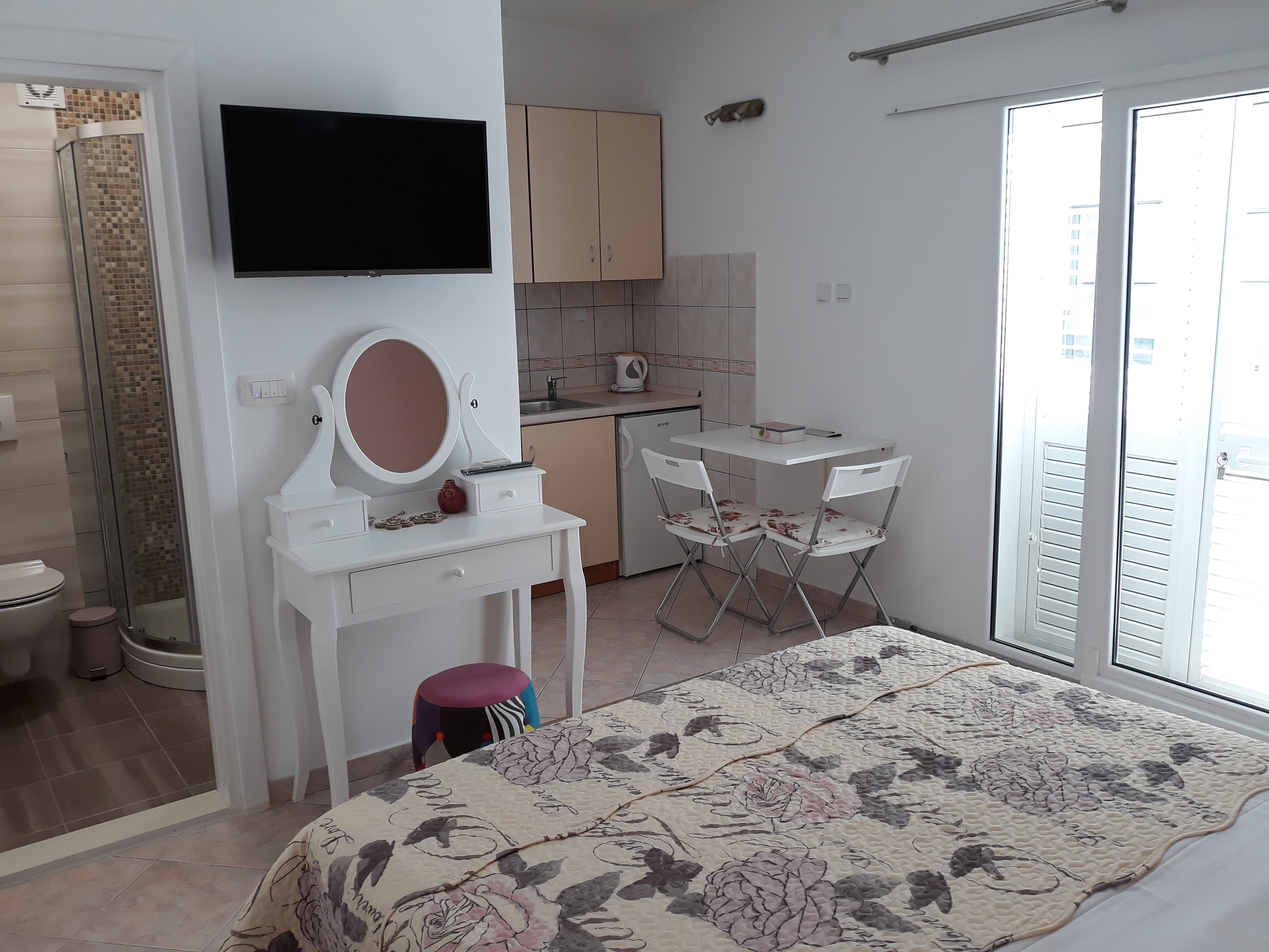 Studio flat can accommodate 2 guests. Beds are situated in 1 sleeping rooms, within 18m2. Guests can use a private terrace to enjoy the warm summer evenings. The studio offers the sea view. Food can be prepared using barbecue which is shared with other guests too. INCLUDED IN THE PRICE: tourist tax, final cleaning, air-conditioning, parking, internet, hairdryer. The availability of additional services for your chosen dates of stay, as well as their prices (if none are listed) must be checked ahead of time. Any additional services not shown in the price calculation are payable directly to the property owner and only if used by the visitor.