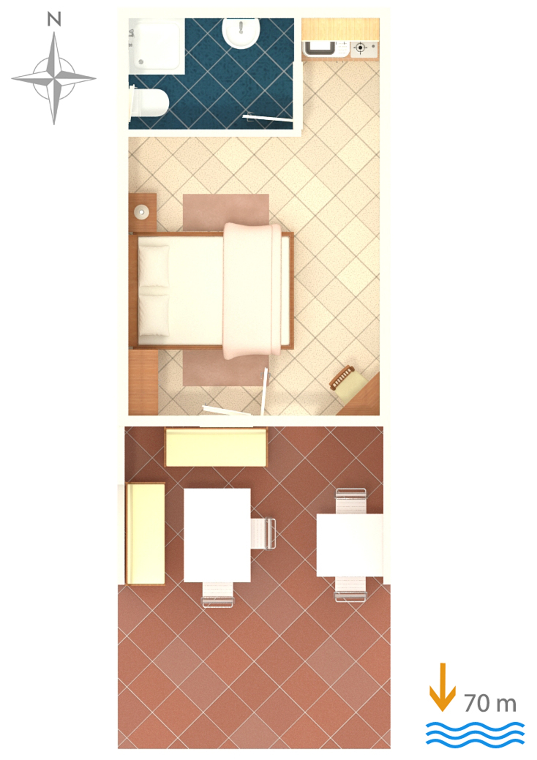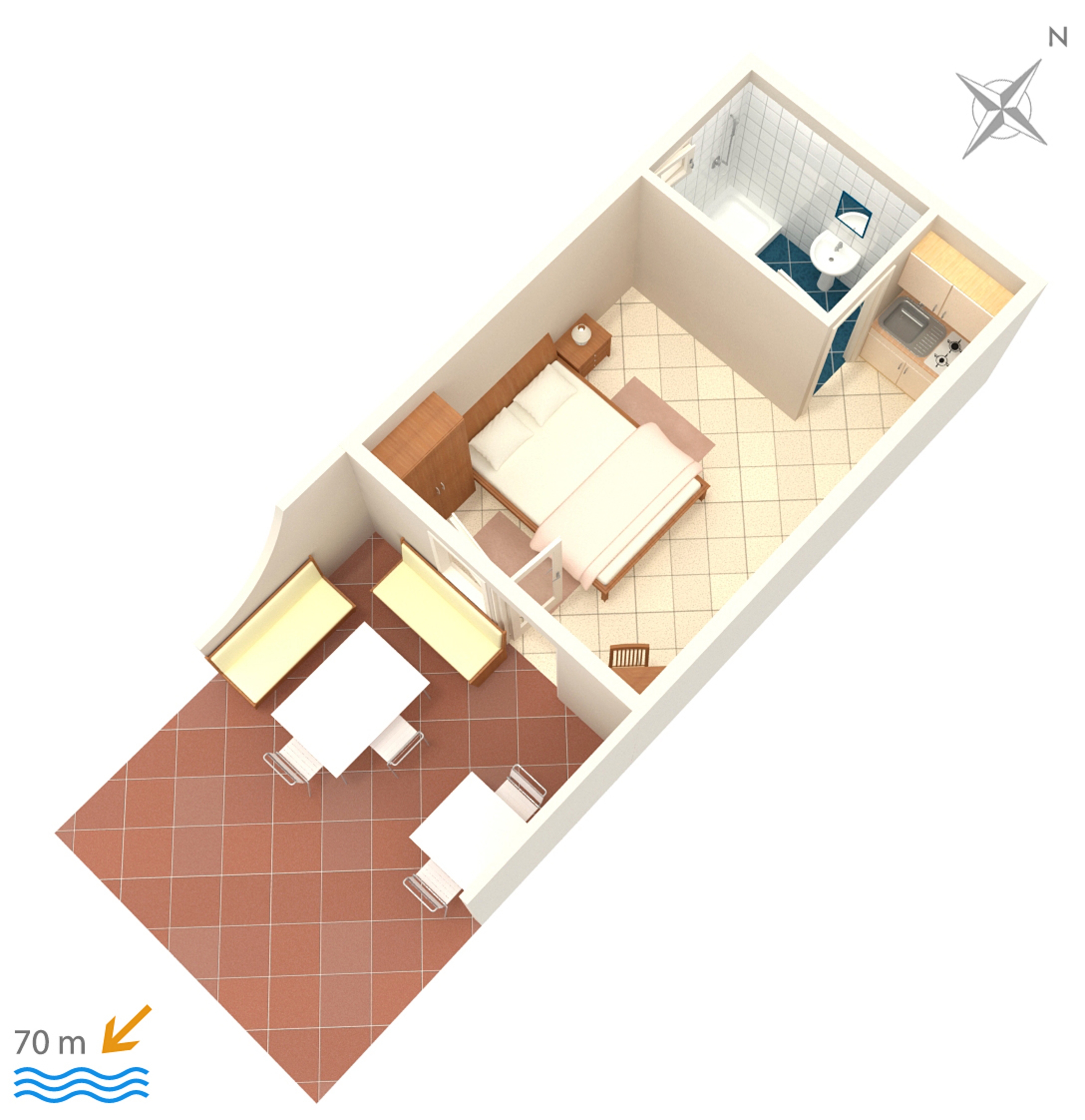 Studio flat can accommodate 2 guests. Beds are situated in 1 sleeping rooms, within 20m2. Guests can use a private terrace to enjoy the warm summer evenings. The studio offers the sea view. Food can be prepared using barbecue which is shared with other guests too. INCLUDED IN THE PRICE: tourist tax, final cleaning, parking, internet, sunchairs. OBLIGATORY ADDITIONAL COSTS: short stay fee (surcharge depending on a number of booked nights: 30% - 1, 20% - 2, 10% - 3). OPTIONAL ADDITIONAL COSTS: air-conditioning (€5.00 per night), 1 bed for children (€5.00 personnight). The availability of additional services for your chosen dates of stay, as well as their prices (if none are listed) must be checked ahead of time. Any additional services not shown in the price calculation are payable directly to the property owner and only if used by the visitor.