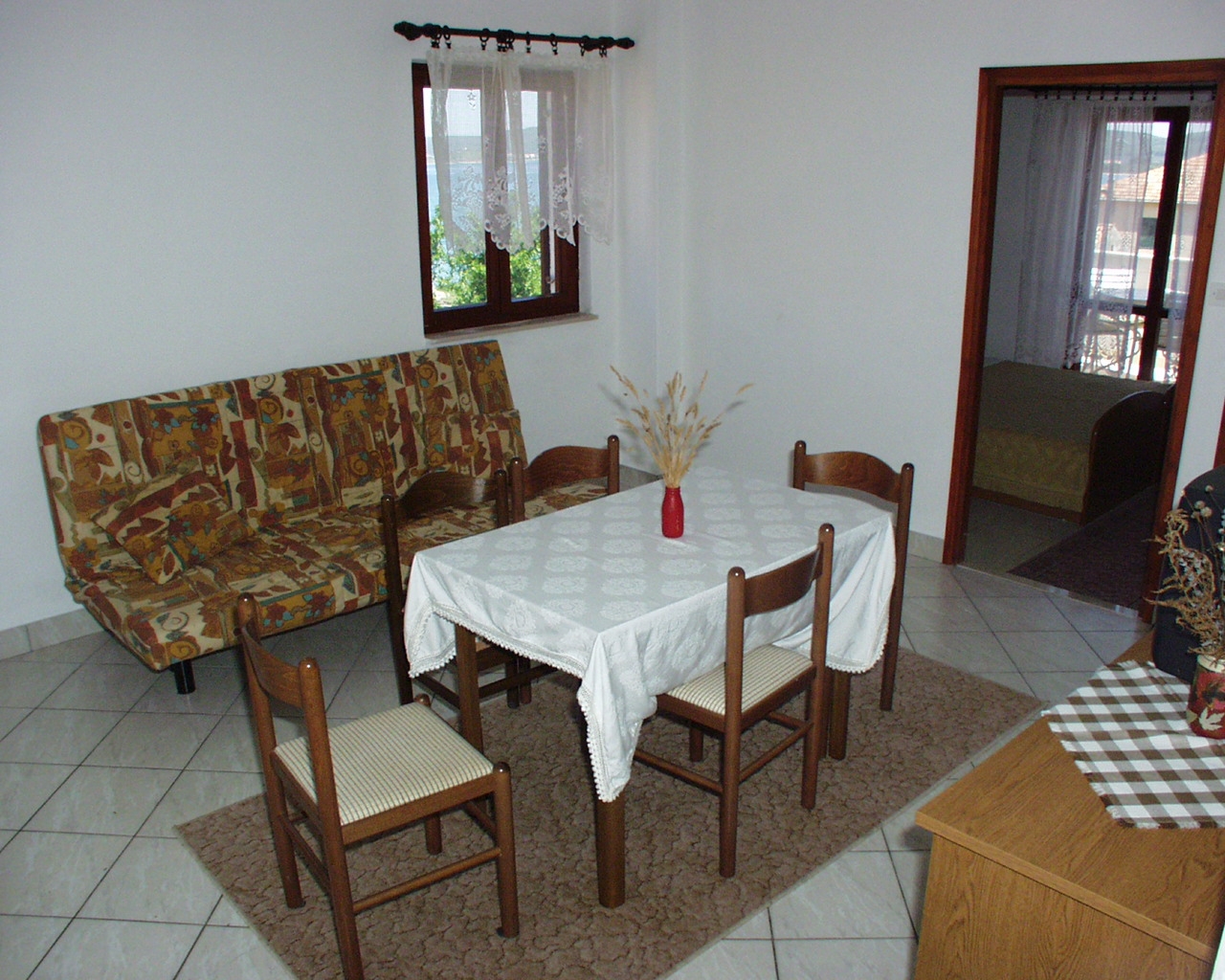 Apartment can accommodate 5 guests. Beds are situated in 2 sleeping rooms, within 35m2. Guests can use a private terrace to enjoy the warm summer evenings. The apartment offers the sea view. Food can be prepared using barbecue which is shared with other guests too. This accommodation unit welcomes pets at an additional charge. INCLUDED IN THE PRICE: tourist tax, final cleaning, parking, internet, iron, ironing board, hairdryer. OBLIGATORY ADDITIONAL COSTS: short stay fee (surcharge depending on a number of booked nights: 30% - 1, 20% - 2, 10% - 3). OPTIONAL ADDITIONAL COSTS: air-conditioning (€0.50 per hour), pets (€15.00 per night). The availability of additional services for your chosen dates of stay, as well as their prices (if none are listed) must be checked ahead of time. Any additional services not shown in the price calculation are payable directly to the property owner and only if used by the visitor.