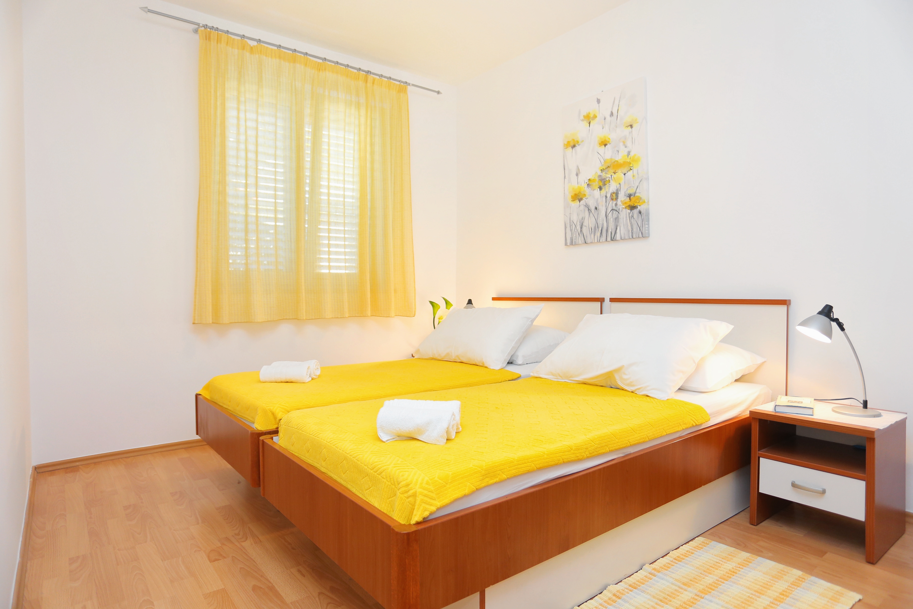 Apartment can accommodate 4 guests. Beds are situated in 2 sleeping rooms, within 54m2. Guests can use a private terrace to enjoy the warm summer evenings. The apartment offers the sea view. Food can be prepared using barbecue which is shared with other guests too. INCLUDED IN THE PRICE: tourist tax, final cleaning, air-conditioning, parking, internet, boat mooring, iron, ironing board, hairdryer, 2 beds for children (included in the price). OBLIGATORY ADDITIONAL COSTS: short stay fee (surcharge depending on a number of booked nights: 30% - 1, 20% - 2, 10% - 3). OPTIONAL ADDITIONAL COSTS: laundry (€5.00 washing). The availability of additional services for your chosen dates of stay, as well as their prices (if none are listed) must be checked ahead of time. Any additional services not shown in the price calculation are payable directly to the property owner and only if used by the visitor.