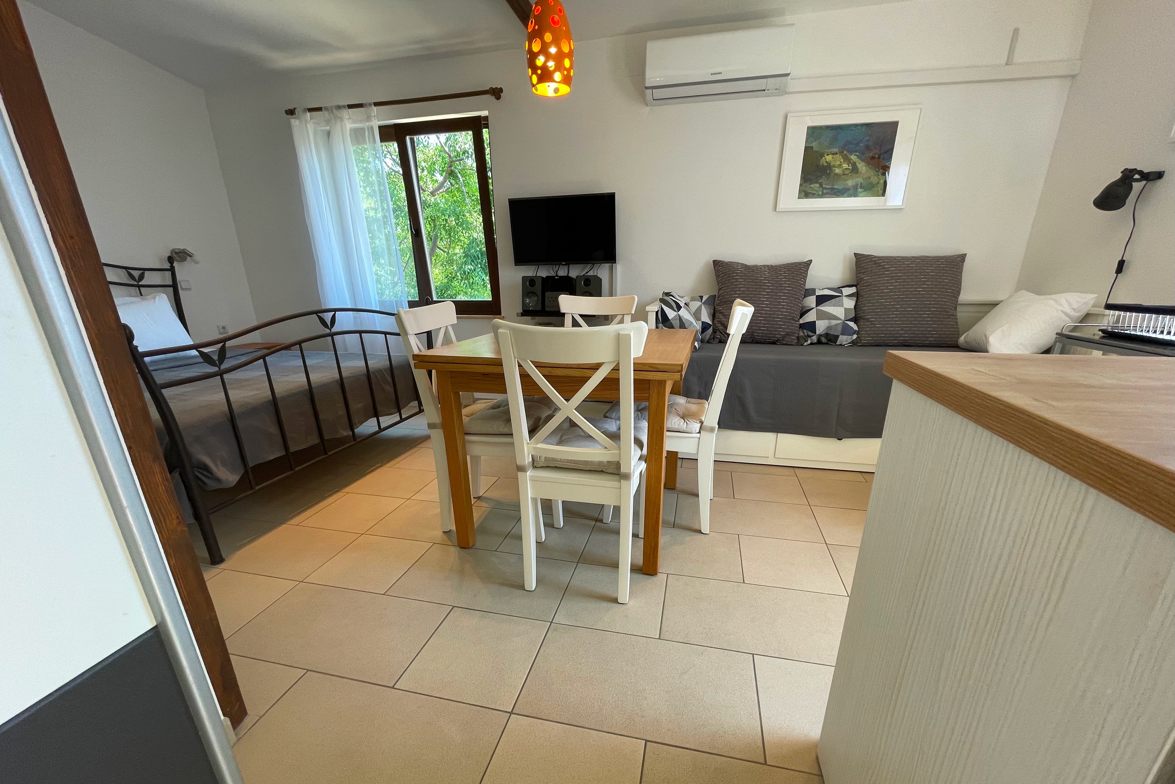 Studio flat can accommodate 3 guests. Beds are situated in 1 sleeping rooms, within 25m2. Food can be prepared using barbecue which is shared with other guests too. This accommodation unit welcomes pets at no additional costs. There is no balcony or terrace in the reserved accommodation unit. INCLUDED IN THE PRICE: tourist tax, final cleaning, air-conditioning, parking, internet, pets, additional bed, iron, ironing board, hairdryer. The availability of additional services for your chosen dates of stay, as well as their prices (if none are listed) must be checked ahead of time. Any additional services not shown in the price calculation are payable directly to the property owner and only if used by the visitor. Discounts to the base price: free day 14=13 (for reservations of 14 or more days you get one free day for the stay until 31122026).