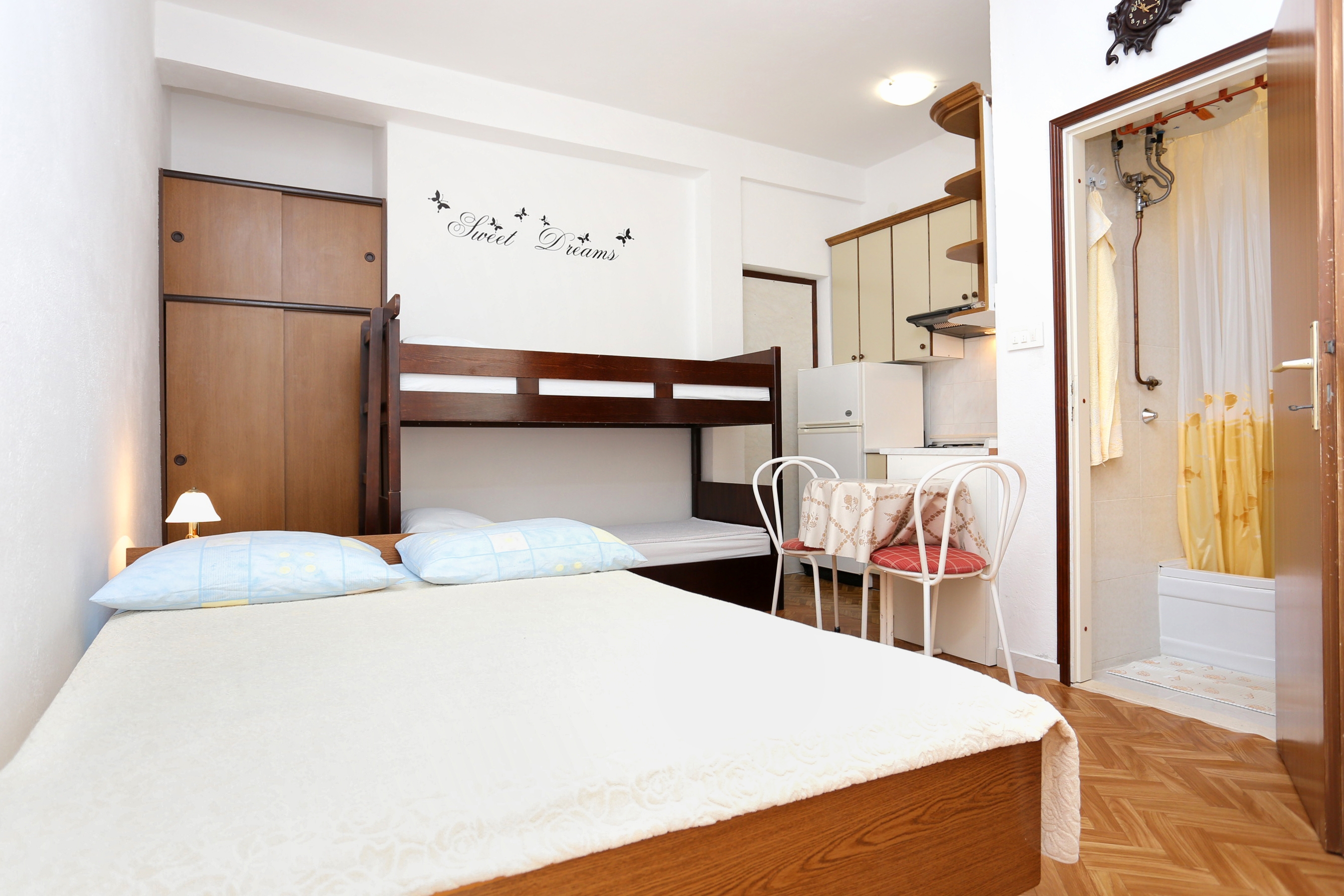 Studio flat can accommodate 4 guests. Beds are situated in 1 sleeping rooms, within 17m2. Guests can use a private terrace to enjoy the warm summer evenings. The studio offers the sea view. Food can be prepared using barbecue which is shared with other guests too. INCLUDED IN THE PRICE: tourist tax, final cleaning, parking, internet, boat mooring. OBLIGATORY ADDITIONAL COSTS: short stay fee (surcharge depending on a number of booked nights: 30% - 1, 20% - 2, 10% - 3). OPTIONAL ADDITIONAL COSTS: air-conditioning (€10.00 per night), laundry (€5.00 washing). The availability of additional services for your chosen dates of stay, as well as their prices (if none are listed) must be checked ahead of time. Any additional services not shown in the price calculation are payable directly to the property owner and only if used by the visitor.
