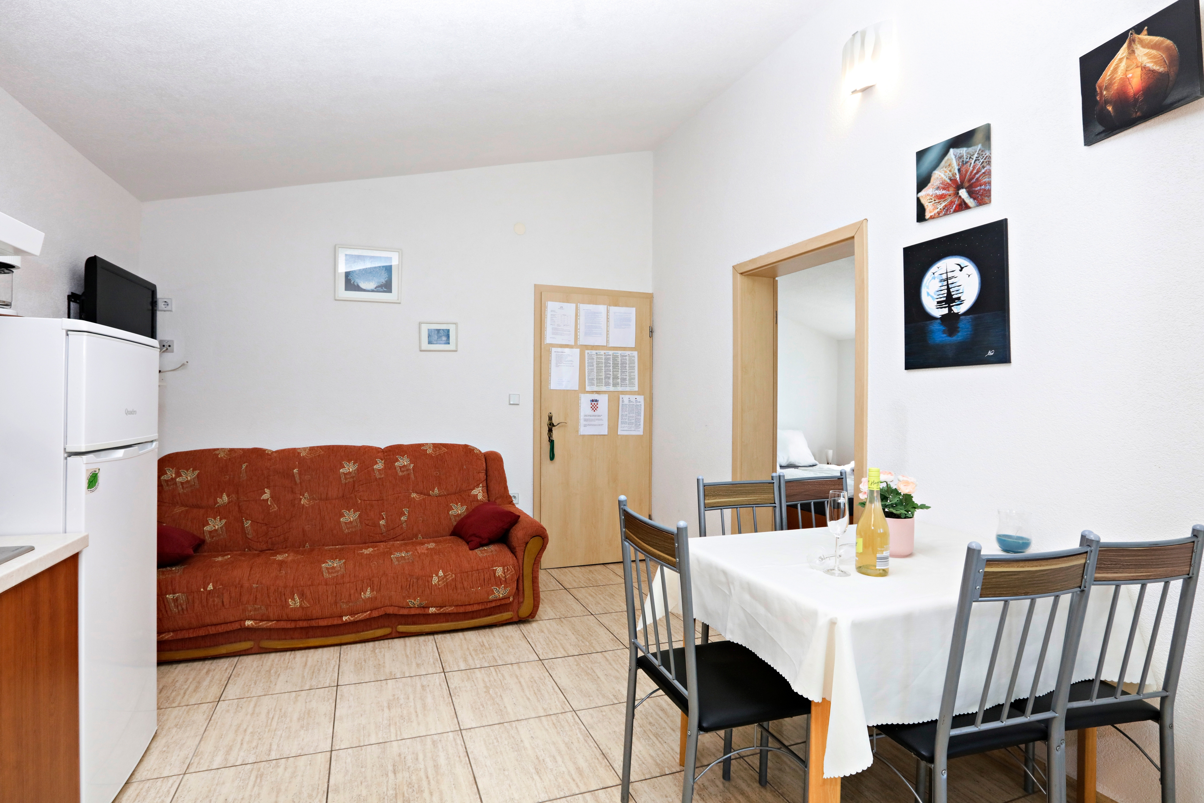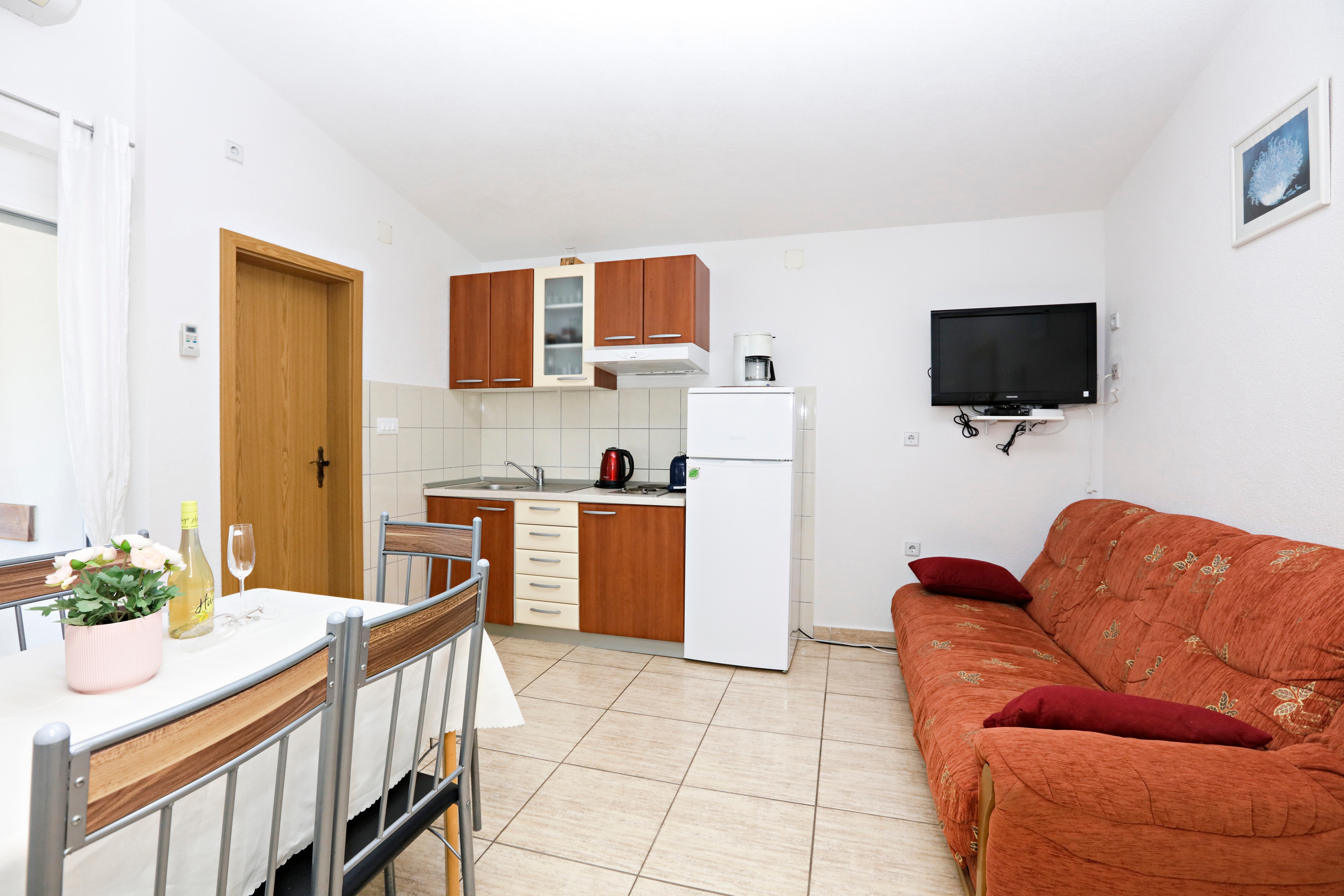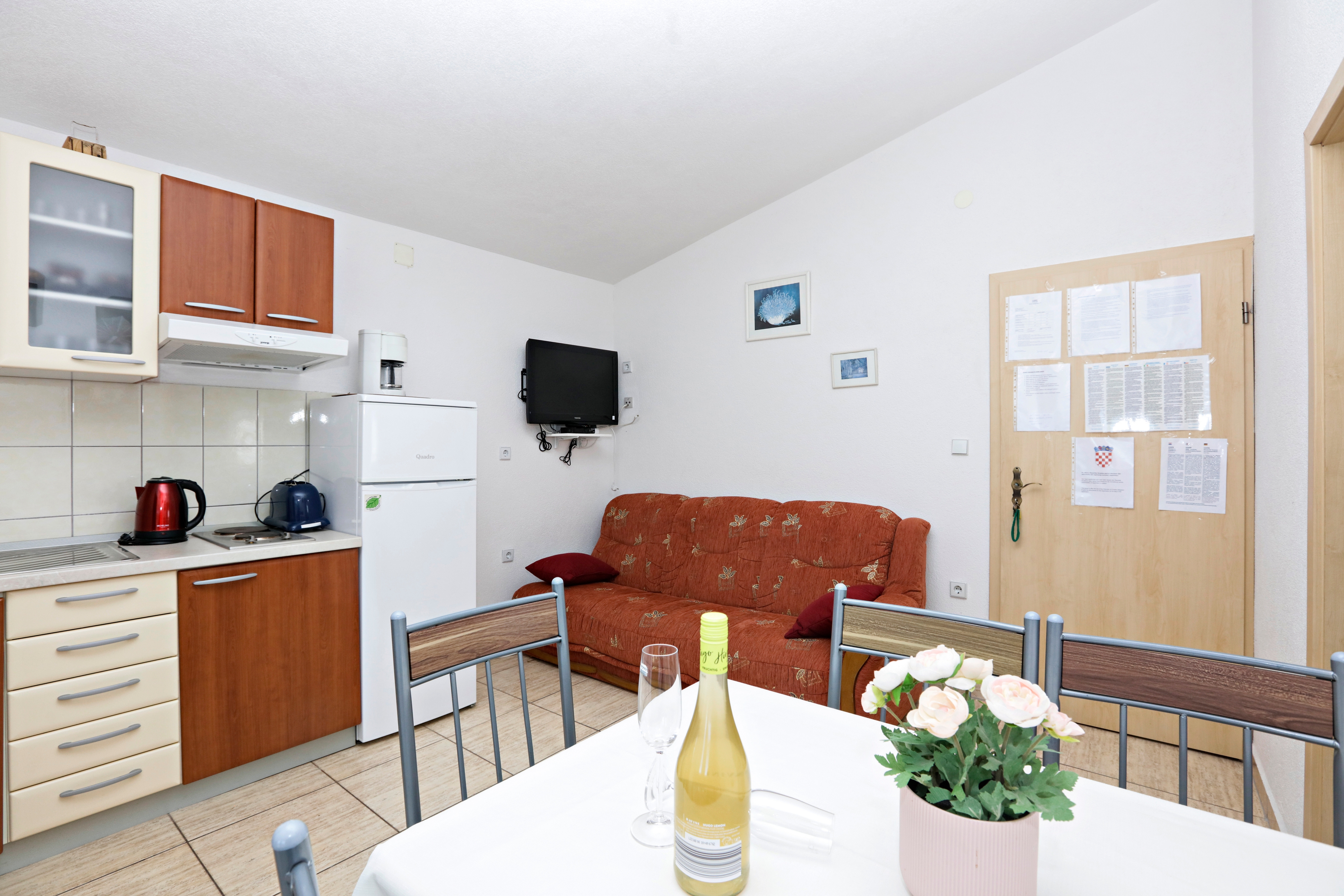 Apartment can accommodate 4 guests. Beds are situated in 1 sleeping rooms, but also in the living room, within 35m2. Guests can use a private terrace to enjoy the warm summer evenings. The apartment offers the sea view. Food can be prepared using barbecue which is shared with other guests too. Shared pool is on disposal during stay. INCLUDED IN THE PRICE: tourist tax, final cleaning, air-conditioning, pool, parking, internet, baby cot, iron, ironing board, hairdryer, sunshade. The availability of additional services for your chosen dates of stay, as well as their prices (if none are listed) must be checked ahead of time. Any additional services not shown in the price calculation are payable directly to the property owner and only if used by the visitor.